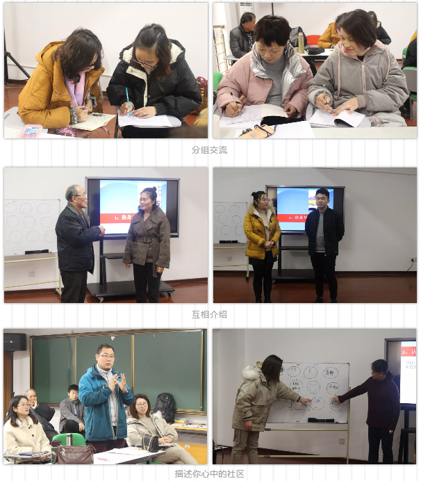 课程正式开始前,许老师带领大家进行了一场别开生面的热身活动,通过报数分组进行现场访谈交流,并引导大家通过简明的词语或线条描述自己心中的社区,增强了彼此的认识与了解,活跃了现场的气氛。