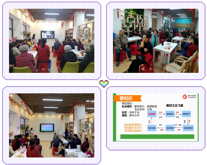 一段视频让居民对“什么是社区微治理、微改造?为什么要进行微治理、微改造?”有了初步的了解。江北社区微治理、微改造中,居民作为参与的主体,社区提供可供发挥的平台,社会组织作为载体依托,链接资源,提供专业支持引导居民参与社区建设,让社区的地盘你做主,力图使活动服务常规化,常规服务项目化,项目服务品牌化,致力打造美好江北飞雁团队,实现社区更美好,居民生活更幸福快乐。