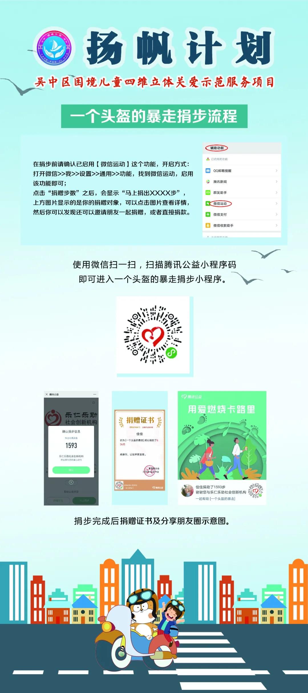 第一,“线上平台,爱心捐步”。公众通过日常行走累积的步数即可兑换善款,为吴中区困境儿童定向捐赠头盔。