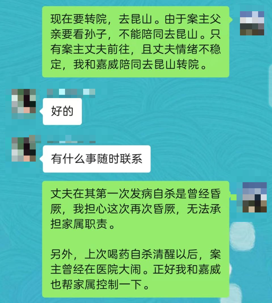 社工到达锦溪医院抢救室外,与家属就事发经过、复发史、复发原因进行沟通确认。服务对象于当日下午趁家人外出之际,突然外出购农药服下,被发现时已经失去意识,急诊科医生认为较为严重,可能有生命危险,建议洗胃后送昆山市区大医院进一步救治。家属情绪激动,无法高效处理转院手续。社工给予心理支持,协助处理转院手续。家里另有未成年子女需要照顾,为了孩子的情绪稳定,社工建议孩子爷爷留在家里。鉴于家属有应激反应,恐无法完全继续独立承担家属职责,社工在确认求助需求后,与家属共同将服务对象送往大医院。期间,锦溪精康社工团队线上密切高效协同,决策最佳介入思路。