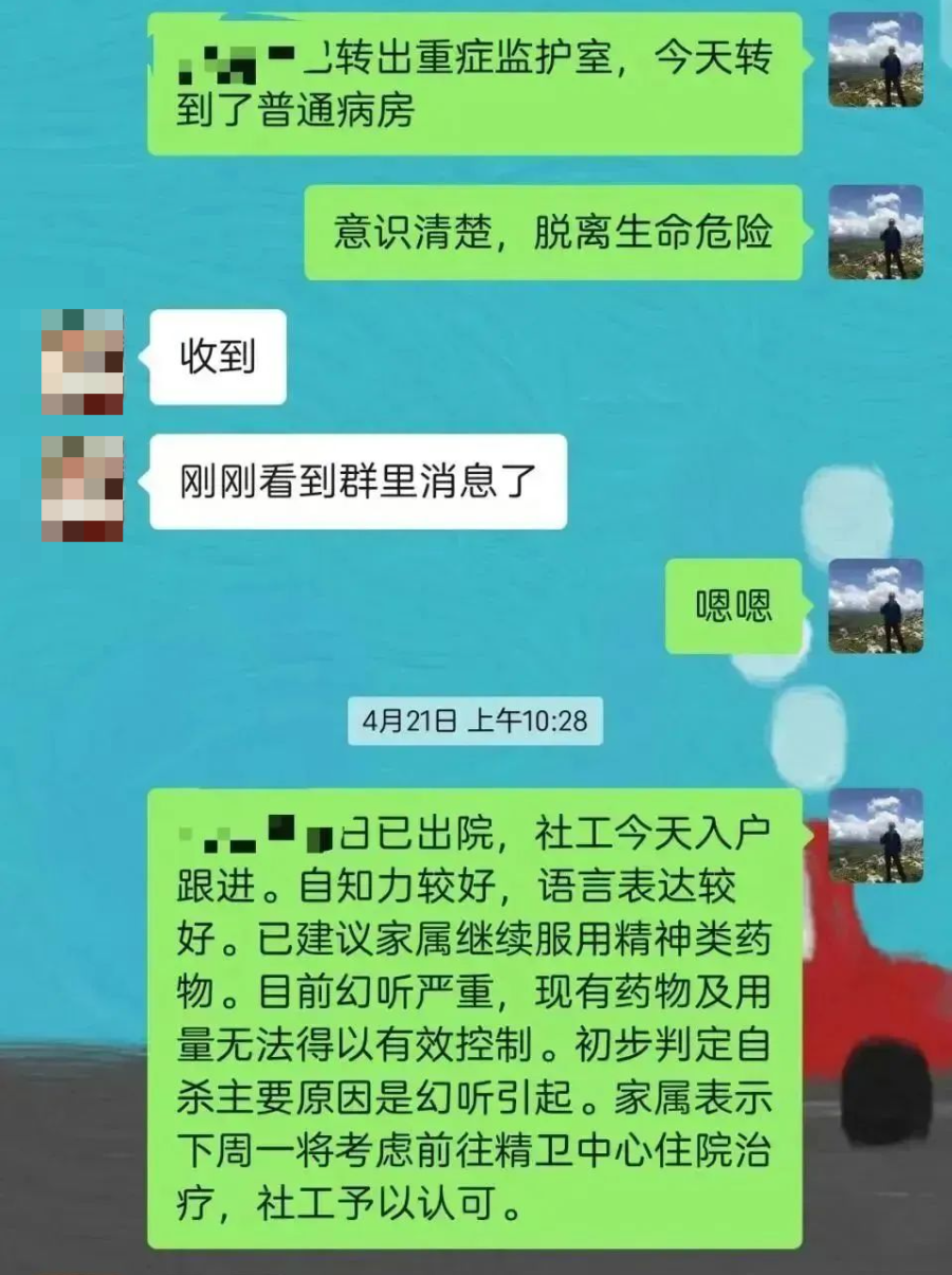 4月18日,家属主动联系社工,表示服务对象已脱离生命危险,转至普通病房。社工给予家属预防再次自杀的指导,建议家属全天候陪护,指导家属在言语上给予服务对象鼓励包容,建议其女儿前来看望,为其注入希望和爱,使其配合治疗。并提醒其注意征求医生建议,适当辅助服用精神类药物,以恢复其稳定的心境。