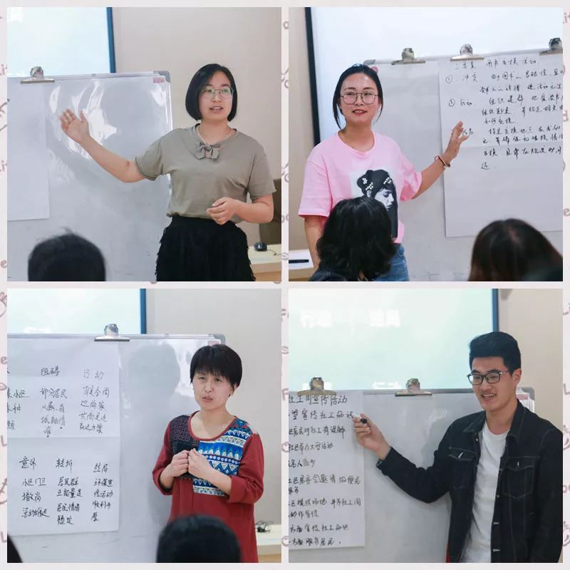 下午的培训更加侧重于实践。李冉首先用十句话总结了新闻、故事和软文的写作套路,以及在具体操作过程中需要遵循的三要素、七环节原则。接下来的十五分钟,每个组都进行了组内讨论,把自己在项目开展过程中发生的一个故事,按照三要素或者七环节的原则进行了复述,并写在大白纸上分享给了大家。