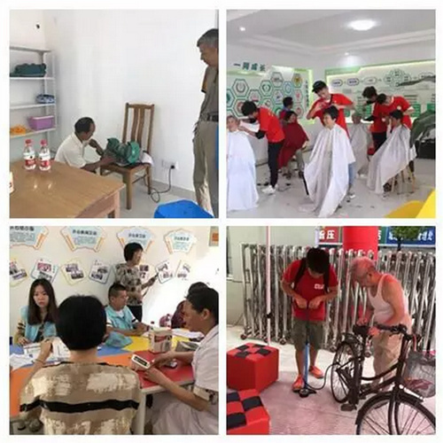在公益表演进行的同时,公益一条街上的便民服务也提前开展起来了。本次中心提供的服务有健康义诊、免费理发、维修拉链纽扣、磨菜刀剪刀和维修自行车、免费拍照体验以及婚姻家庭心理咨询等内容。