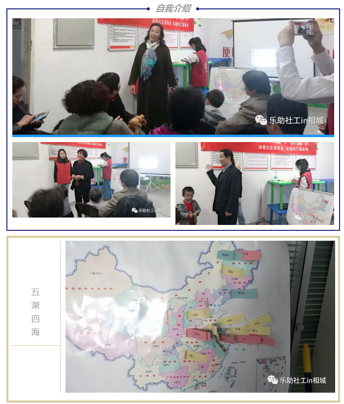 “了不起的爸妈”主要面向的人群是“新苏州人父母”,为让全国各地的“爸爸妈妈”相互认识,乐助社工小吴精心设计了以“Hometown(家乡)”为主题的团队自我介绍。每位成员在自我介绍后,将带有名字的小纸签贴在地图的相应位置。