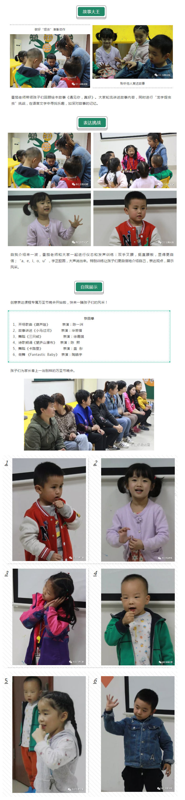 创意表达课程通过绘本阅读、手工制作、亲子互动、剧场演绎等形式,引导孩子提高语言表达能力、社会交往能力和艺术表现能力。而家长在课程中不仅是一个陪伴者,也是一个学习者,他们和孩子互动并及时给予鼓励,同时学习各种引导技巧,与孩子亲密相伴,一起成长。金秋十月,大家都是收获满满呢!