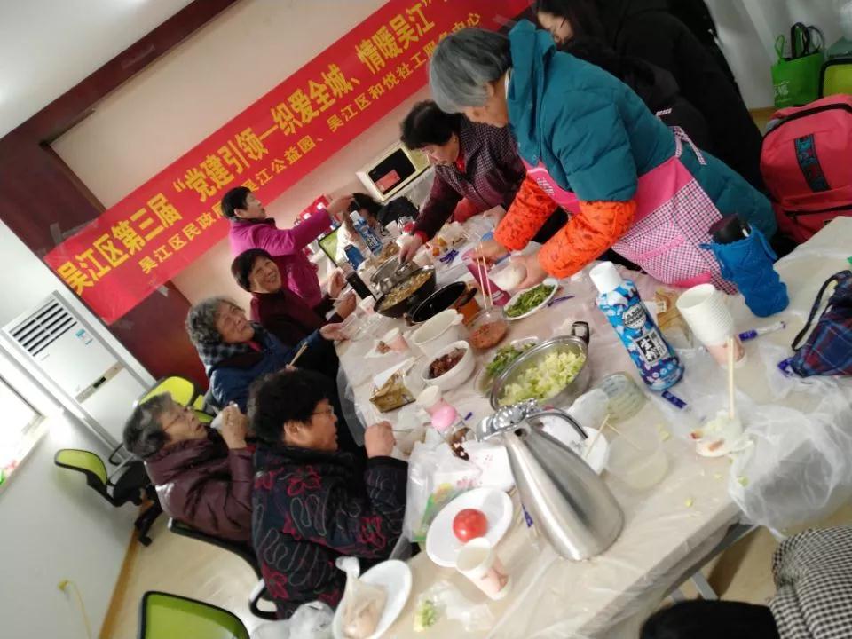 吴江区第三届“党建引领--织爱全城、情暖吴江”---暖融合活动于2019年1月25日完成,该活动受益人数达20人,以“美食工作坊”形式,在吴江公益园举办。该活动以“老漂族和本地老人”融合共情为目标,旨在通过美食工作坊搭建松陵镇老漂族和本地老年人的在地沟通平台,提升他们对吴江的归属感和认同感。该活动参与对象来自大江南北,属地特色也各不相同,不同美食的汇聚背后是文化和习俗的融合。