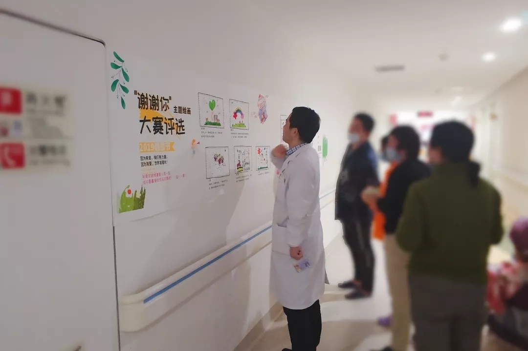 11月最后一周的周四是感恩节,在这个温暖的日子里,我们将孩子们的画展示出来,举行了一场评选活动。平日里大人们步履匆匆的病房走廊,热闹了起来。家长、医生、护士、小朋友,大家纷纷驻足欣赏孩子们的作品,给心中最喜欢的一幅画投票。几位参与绘画大赛的孩子,则积极地在一旁给自己的作品拉票。