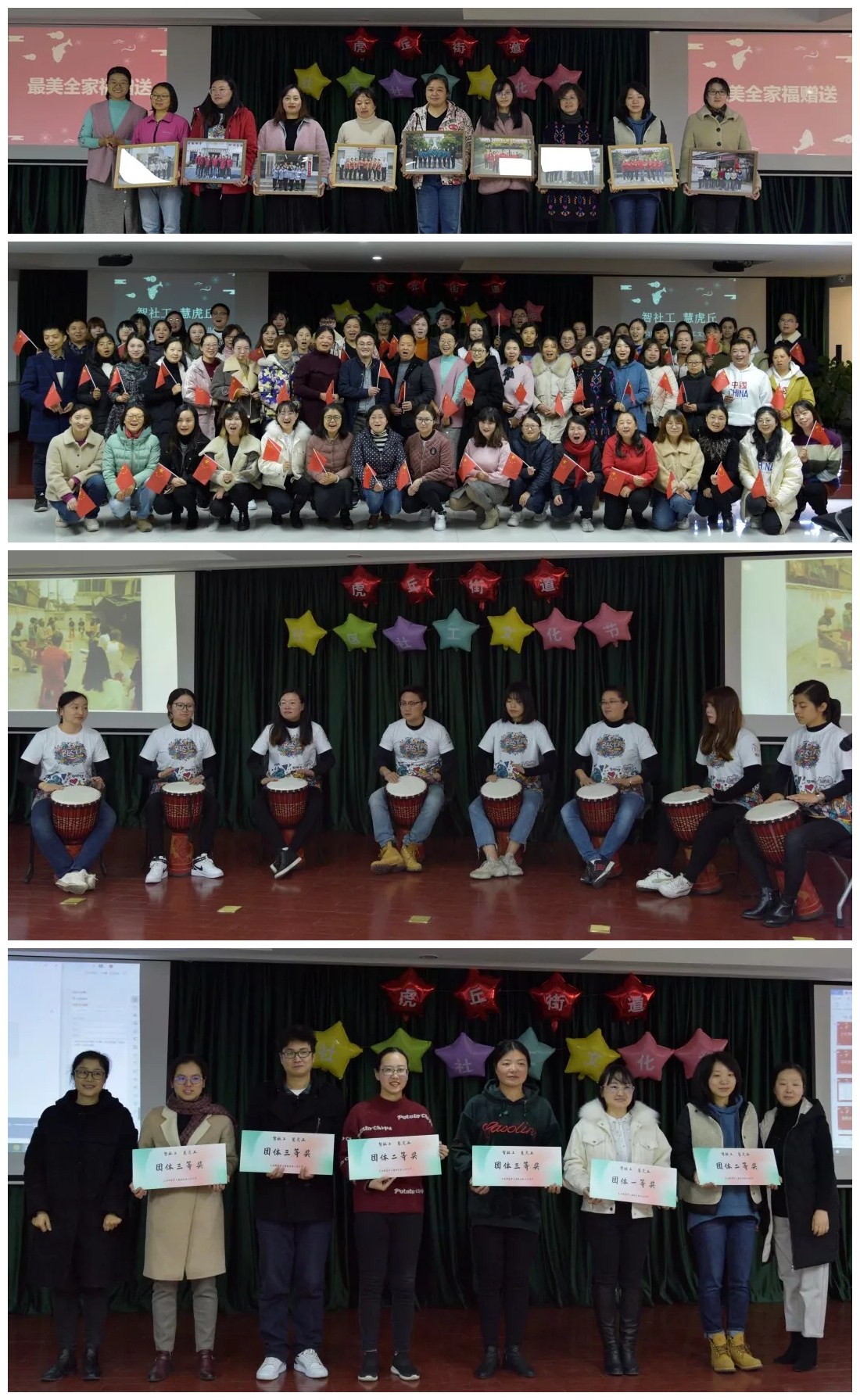 通过“纸点江山”、“精打细算”、“最强社工”三场互动游戏的开展,激发了社区社工的参与、合作与竞争意识,在视频回顾展示中,定格了精彩瞬间。活动现场,公布各社区团体成绩,并由陆小娟副处长和李群所长进行颁奖。此次文化节活动,在街道倡议下,邀请专业摄影师为各社区拍摄了证件照与全家福,由王重民处长、陆卿现场赠送,各社区社工们积极昂扬的精神状态,映衬出虎丘街道奋发向上的工作气质。
