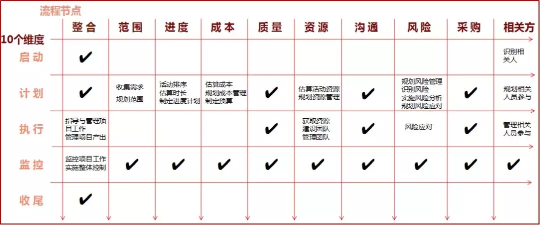 费凡老师认为项目管理是项目的管理者,在有限的资源约束下,运用系统的观点、方法和理论,对项目涉及的全部工作进行有效地管理。纵向节点管理,横向维度把控。节点即为流程节点,分为启动、计划、执行、监控、收尾,维度是整合、范围、进度、成本、质量、资源、沟通、风险、采购、相关方等10个维度。在节维(节点与维度如下图所示的交错点)中落实具体事项: