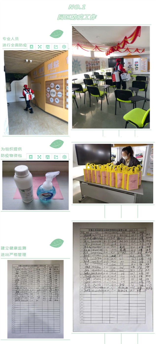 根据上级部门复工防疫要求,无锡公益创新创业园于2020年3月23日正式对外开放,各入园组织按要求陆续进入园区办公复产。园区工作人员严格按照防疫相关通知,在做好园区整体疫情防控管理工作的同时,协助各入园组织安全有序复工复产。园区制定了《无锡公益创新创业园新型冠状病毒感染的肺炎疫情应急预案和工作方案》,为各入园组织提供防疫物资包,完善疫情报告制度,建立快速反应和应急处理机制、每日防疫消杀制度,严格管理外来人员进出园区……