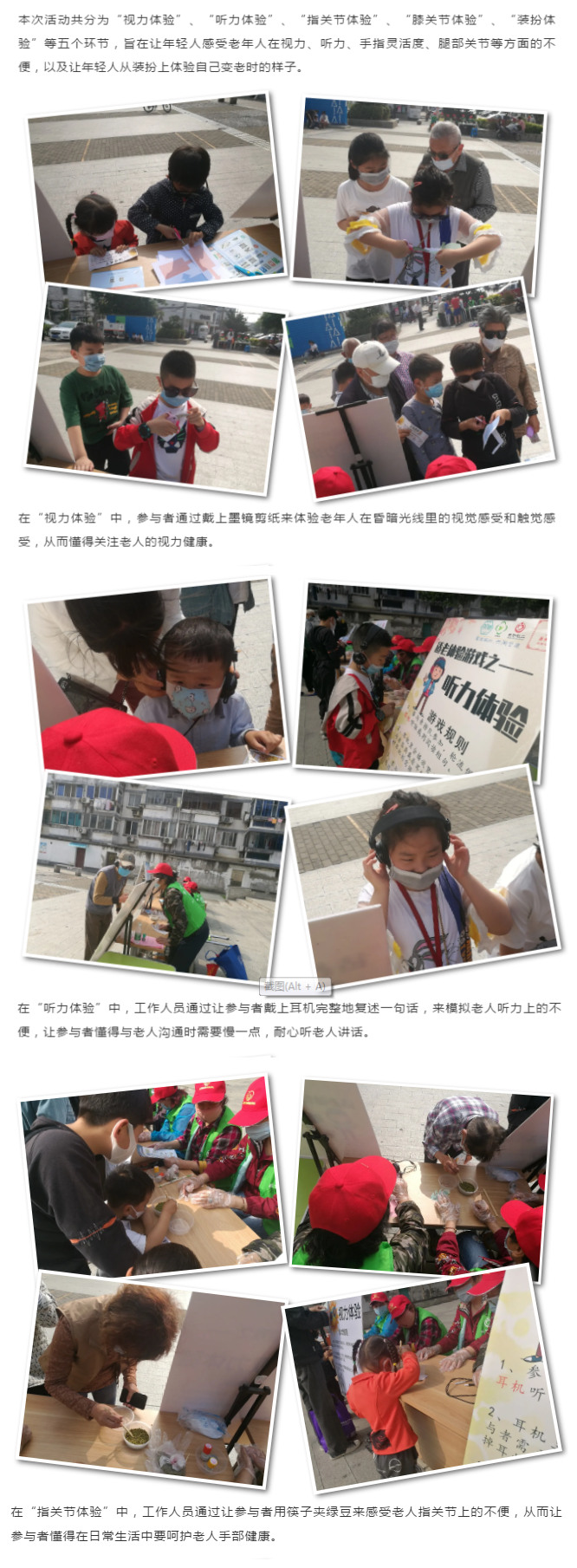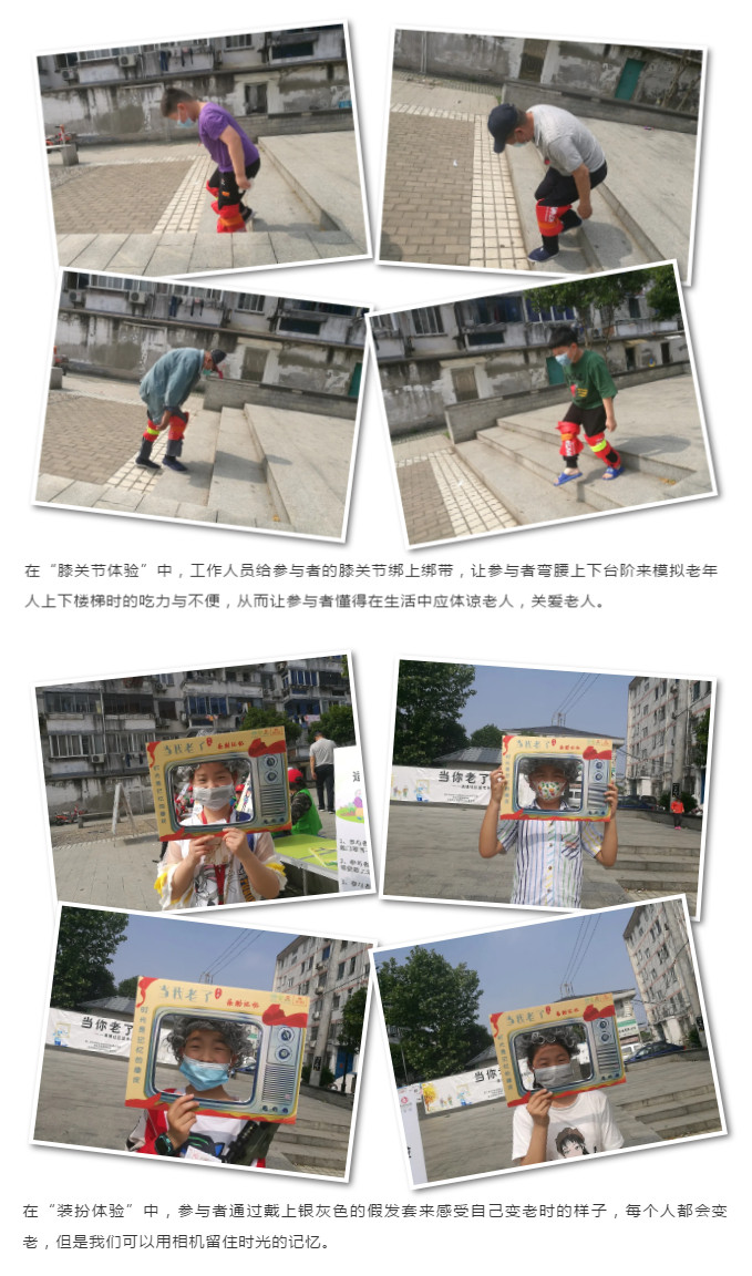 通过本次活动的参与体验,宣传了关爱老人的文化,让社区的青少年体会了老人日常生活的不便,从而激发青少年敬老爱老的意识,懂得尊敬老人就是尊敬我们自己。
