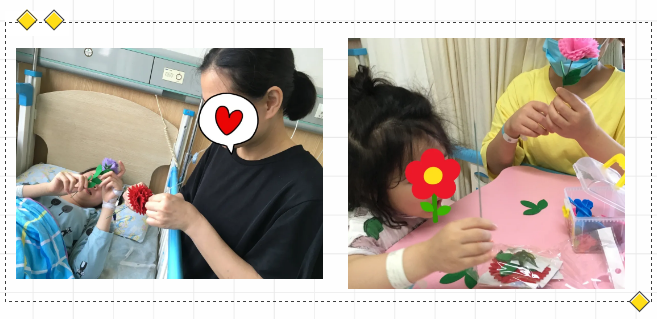 护士节前夕,社工组织了患儿家长手工花制作活动。孩子们在游戏室自主活动的同时,家长们通过手工放松心情,减缓对疾病的过度关注,也因此有了一个互相交流的场景与机会。