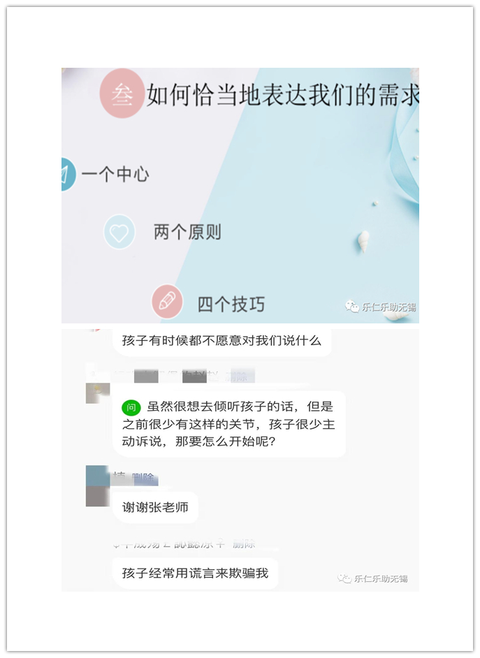 5月13日,乐助社工携手无锡市妇联婚姻家庭教育指导师张红,与春蕾学校初中部学生家长相聚“空中课堂”,聚焦亲子沟通,助力亲子关系改善。