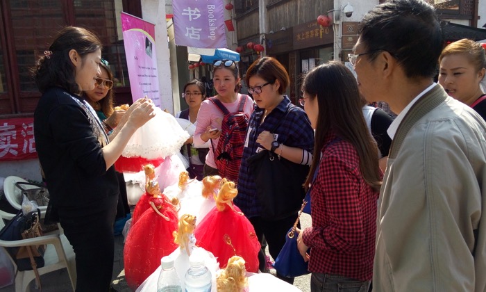 本次活动是该组织开展的“义卖”活动之一,其主要目的是将之前残疾人集中制作的婚纱娃娃卖出,来增加残疾人的收入。通过前期与山塘街旅游办的协商,项目方在人流量很大的山塘街古戏台摆好了桌椅,并在桌子上整齐的摆放好大家做的造型各异的婚纱娃娃,来吸引游客;同时在桌子旁放上易拉宝介绍“虎丘婚纱娃娃”这个公益项目。由于娃娃价格比较低,一个上午,陆陆续续有游客来光顾,并买走一两个娃娃。此次义卖活动要到下午才结束。