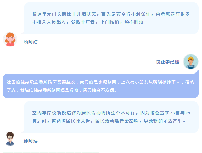 会议中,登云社区顾书记、蒋书记就征集的九条协商议题逐条做扩展性讲解,让居民代表及物业代表能更加透彻的了解议题的内容,之后进入多方自由交流时间: