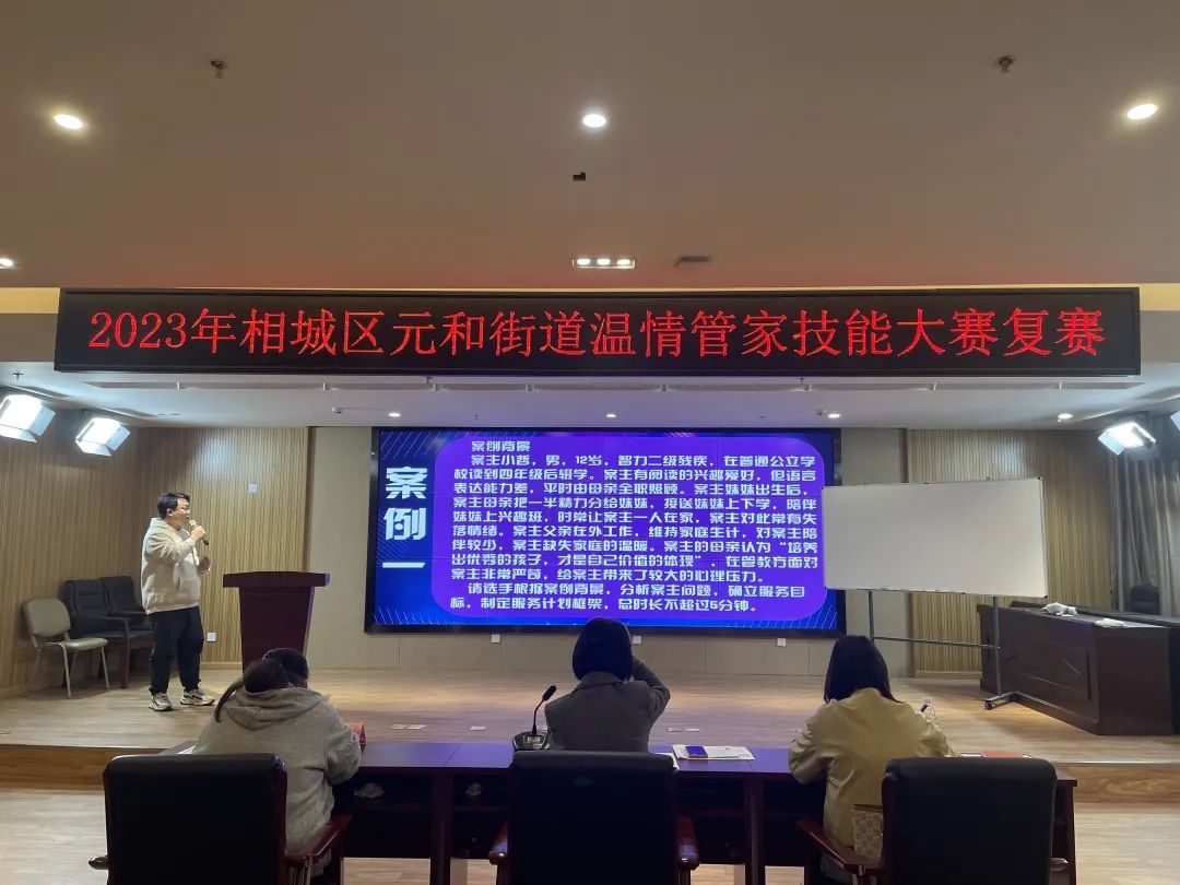 为提高元和街道辖区温情管家的实务技能,提升温情管家的整体素质,相城高新区(元和街道)开展了温情管家技能大赛。经过初赛的比拼,共有12位选手进入了4月23日的复赛。复赛由案例分析与看图说话构成,各12道题目。评委根据选手表现进行现场打分。最终得分由高到低的6名选手将进入决赛,并现场抽取决赛时的演讲主题。