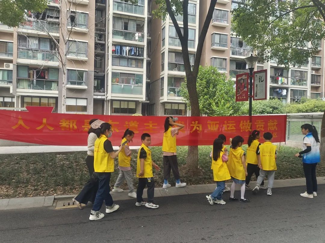 社工首先带领小小议事员在社区里面进行了“绿色环保亚运行”,对小区里可见的白色垃圾、烟头等开展了巡查与处理。在此过程中,一边寻找社区里有关迎亚运主题的标语、logo、KT板等,为后续设计和布置“亚运角”打基础、拓视野。