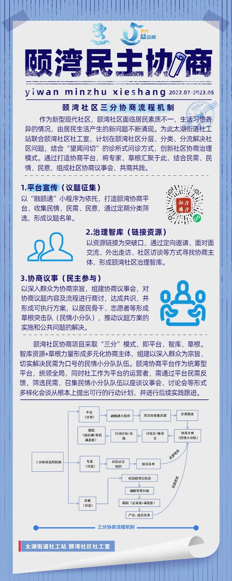 “三分协商·治理有方”颐湾社区诊所式协商治理服务是由太湖街道社会工作站、苏州市姑苏区乐助社工事务所、颐湾社区社工室共同推动的社区民主协商治理服务项目。项目通过在颐湾社区分层、分类、分流解决社区问题,结合“望闻问切”的诊所式问诊方式,创新社区协商治理模式。项目最终目标在于通过对协商内容进行分事协商,对过程进行分段协商,对协商的规模进行分级协商,形成“三分协商,治理有方”的颐湾社区诊所式治理服务模式。