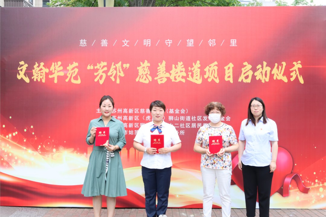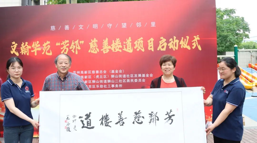 6月13日下午,文翰华苑“芳邻”慈善楼道项目启动,横塘街道人大工委主任陆建根、狮山横塘街道为民服务中心主任吴辰、狮山二社区党委书记居委会主任朱晓琴、文翰华苑业委会主任胡宏玉,招商物业文翰华苑管理处经理王晓红,文翰华苑慈善楼道项目居民团队负责人罗海艳、苏州市姑苏区乐助社工事务所事业部主管朱娟娟出席活动并共同为项目启动剪彩。