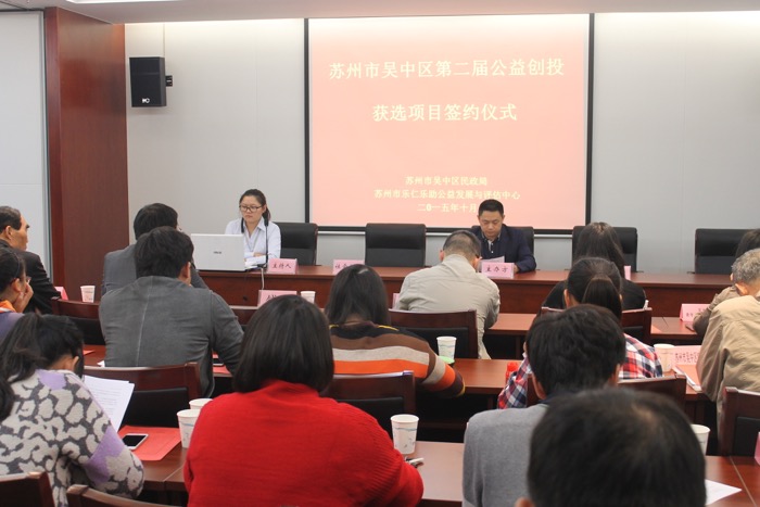 本次签约仪式共分六项议程:一、承办方代表做吴中区第二届公益创投工作汇报;二、主办方代表社会组织科杨科长宣布中标组织名单;三、公益创投三方项目签约,;四,中标社会组织代表代表发言;五、民政局副局长钱刚做主办方发言是;六、吴中区第二届创投项目管理培训。