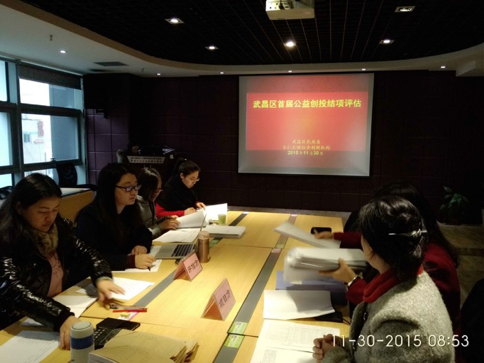 2015年11月30至2015年12月1日,武昌区首届公益创投结项评估现场答辩会在区孵化基地会议室顺利举办,首届公益创投项目负责人、街道会计、社区社工、服务对象等共计50人参加评估,此次会议还特别邀请武汉大学评估专家、后海源财务专家以及第三方乐仁乐助组成评估委员会。