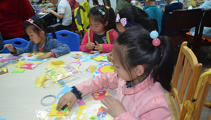 本次活动分为家长组与孩子组,孩子组的学员都在活动室当中进行贴画活动。贴画主要是锻炼孩子的颜色分辨与颜色层次分辨的能力,并且很大的程度上锻炼孩子的动手能力与训练他们的耐心和细心。贴画要求对照原来的图案,将给出的一些零件贴到合适的地方,一朵花可以分成底色,然后将花瓣的颜色一一对应,然后贴上花蕊,使得一朵花具有立体感。活动现场,没有爸爸妈妈帮助的孩子们开始自己动手制作自己的贴花,贴错了,拿下来再贴一遍,找不到自己的零件了,没关系,小伙伴之间问一下,一起找。虽然是开展亲子活动但是适当的孩子独立参与活动,可以发现,孩子们的底气明显稍微不足,但是孩子们的专注力得到提升。接下来的亲子活动内容,具体的操作与开展需要与各位家长商量,能够安排出更好的内容和课程,建立良好的亲子活动平台。