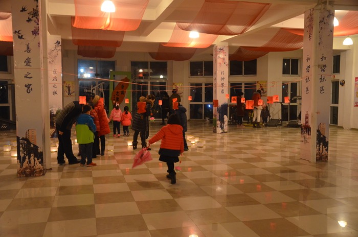 活动开始前,亲子俱乐部3个小志愿者提前到来,帮忙摆放花灯。将灯谜纸条藏在一楼的角落让参与者寻找。活动开始时,前来参与活动的居民一般都是爸爸妈妈带着孩子全家出动,接到的第一个任务就是在大厅里寻找灯谜,拿到工作人员处答谜,顺利猜对可获得莲花彩灯一只。活动过程中照片的拍摄和奖品的发放由我们妈妈志愿者负责发放。很多居民带着孩子在大厅里四处寻找灯谜,玩得不亦乐乎,而已经猜过灯谜获得花灯的居民们则到我们事先摆放展示的花灯处拍照留影。大家在赏花灯、猜灯谜、拍照留影的活动中欢度元宵佳节。
