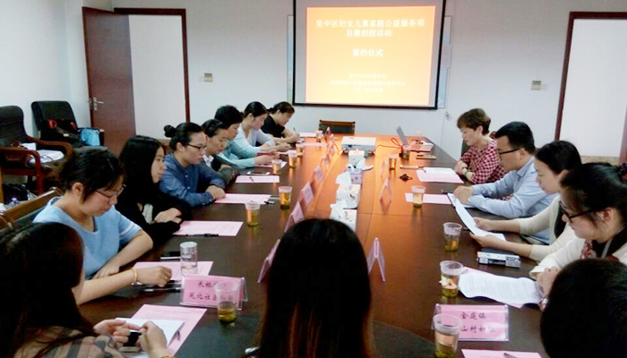5月15日下午,苏州市吴中区妇女儿童家庭公益服务项目微创投活动签约仪式在吴中区妇联会议室顺利举行。出席本次签约仪式的有吴中区妇联副主席张蕾女士、苏州市乐仁乐助公益发展与评估中心的工作人员以及本次微创投活动10个中标项目的社会组织负责人等。本次签约仪式共有四项议程:一是承办方代表作吴中区妇女儿童家庭公益服务项目微创投活动工作汇报以及宣布中标组织名单;二是吴中区妇联副主席张蕾做主办方发言;三是中标社会组织代表代表发言;四是公益微创投三方项目签约。