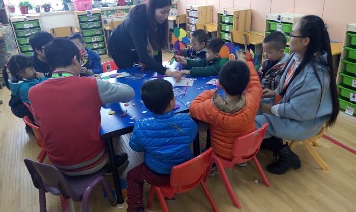 本次活动是该组织开展的“个人技能养成计划”活动之一,主要通过手工制作,促进自闭症儿童的感统训练。本次活动在三个班开展,每个班级10人左右。首先老师将本次活动的材料分发给每一个服务对象,然后根据制作说明书,老师一步一步地教,并和大家一起完成。在一个自闭症比较严重的班级,老师手把手按个的教小朋友制作完成了本次的手工物品。