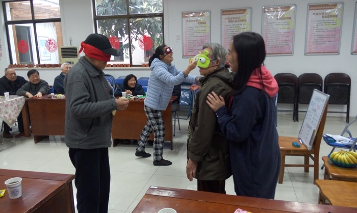 本次活动是该组织开展的“社区活动”之一,其主要目的是增加老人的社区参与度。首先社工将10对服务对象分成红队和蓝队,并讲了本次的活动是通过几个小活动来测试大家的默契。第一个活动是心有灵犀,每对老人一个抽签并画出签上的内容,另一个通过图画猜。通过三组比赛,蓝队得了一分。第二个活动是你侬我侬,两个人都蒙上眼睛,一人给另一人喂香蕉,先吃完的获胜。志愿者先为大家演示了一遍,之后也是每队有三组进行了比赛,最终红队获胜。在活动的最后,社工用拍立得给每对老人拍了一张照片,并给每位老人发了一张贺卡,让他们写要对对方说的话,回家后交换贺卡。