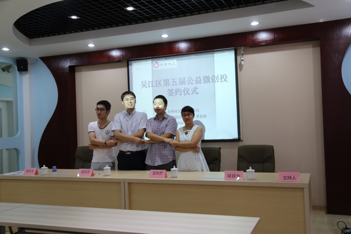 2016年9月27日上午9:30吴江区第五届公益微创投获选项目签约仪式在吴江公益园212会议室正式开始。