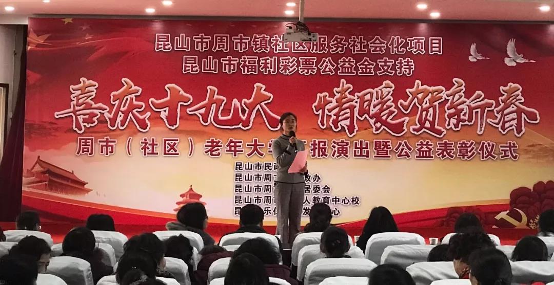 2018年1月10日,以“共庆十九大·情暖贺新春”为主题的周市(社区)老年大学学期末汇报演出暨公益表彰活动在市北村3楼会议室顺利开展。现场邀请了周市文卫办、民政办、社区办、周市社区、长泾社区、迎宾社区等单位部门领导参加。本次汇演除了老年大学的学员以文艺汇演的形式展示学期学习成果之外,现场,针对教学老师、学员骨干班长、指导员以及社区公益服务的志愿者进行了表彰,弘扬正能量。