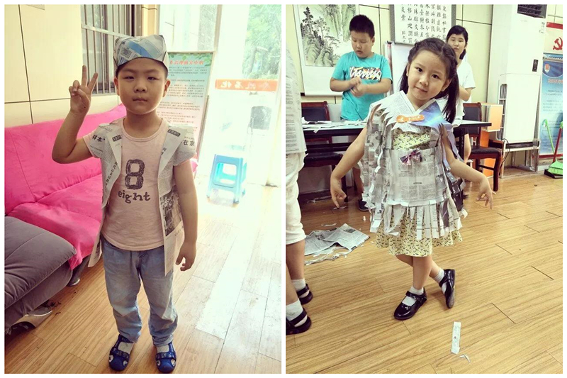 老师先给我们讲了一些环保知识,接着给我们发了好多报纸让我们做“衣服”。