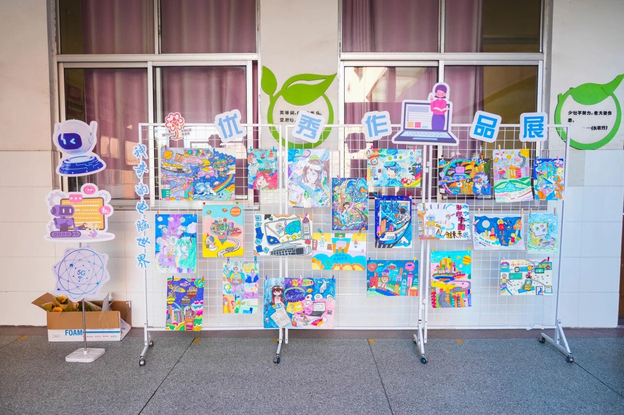 现场展示了学生们围绕“神奇的电脑世界”创作的优秀画作,并由学生代表分享了创作灵感。一幅幅充满想象力的作品,勾勒出孩子们对科技未来的美好憧憬。
